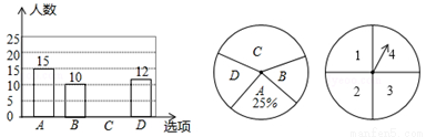 (3)从选项为“D(森林公园)”的学生中抽取了小明和小军两人做游戏,游戏规则如下:每人从1,2,…,8中任意选择一个数字,然后两人各转动一次如图所示的转盘(转盘被分为面积相等的四个扇形),两人转出的数字之和等于谁选择的数,谁就获胜;若小军选择的数是5,用列表或画树状图的方法求他获胜的概率.