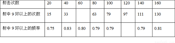 (1)根据上表中的信息将两个空格的数据补全(射中9环以上的次数为整数,频率精确到0.01);