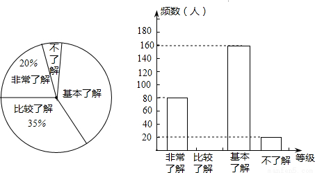 今年是襄阳“创建文明城市”工作的第二年,为了更好地做好“创建文明城市”工作,市教育局相关部门对某中学学生“创文”的知晓率,采取随机抽样的方法进行问卷调查,调查结果分为“非常了解”, “比校了解”, “基本了解”,和“不了解”四个等级.小辉根据调查结果绘制了如图所示的统计图,请根据提供的信息回答问题: