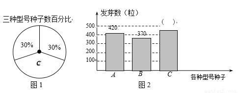 利民种子培育基地用A、B、C三种型号的玉米种子共1500粒进行发芽试验,从中选出发芽率高的种子进行推广.通过试验知道,C型号种子的发芽率为80%,根据试验数据绘制了下面两个不完整的统计图(图1、图2):