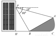 如图所示,小明在大楼30米高(即PH=30米)的窗口P处进行观测,测得山坡上A处的俯角为15°,山脚B处的俯角为60°,已知该山坡的坡度i(即tan∠ABC)为1: