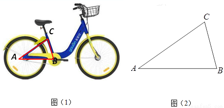 自4月以来,我市推出了一项“共享单车”的便民举措,为人们的城市生活出行带来了方便.图(1)所示的是某款单车的实物图.图(2)是这辆单车的部分几何示意图,其中车支架BC的长为20cm,且∠CBA=75°,∠CAB=30°.求车架档AB的长.