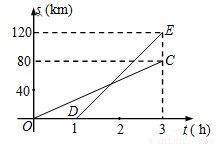 已知A,B两地相距80km,甲,乙两人沿同一条公路从A地出发到B地,乙骑自行车,甲骑摩托车.图中DE,OC分别表示甲,乙离开A地的路程s(km)与时间t(h)的函数关系,根据图象得出的下列信息错误的是( )
