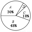 某校对九年级学生进行了一次数学学业水平测试,成绩评定分为A、B、C、D四个等级(注:等级A、B、C、D分别代表优秀、良好、合格、不合格),学校从九年级学生中随机抽取50名学生的数学成绩进行统计分析,并绘制成扇形统计图(如图所示).