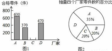 为响应国家的“一带一路”经济发展战略,树立品牌意识,我市质检部门对A、B、C、D四个厂家生产的同种型号的零件共2000件进行合格率检测,通过检测得出C厂家的合格率为95%,并根据检测数据绘制了如图1、图2两幅不完整的统计图.