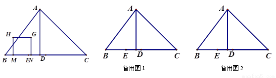 ,∠ACB=45°,AD=8,AD是边BC上的高,垂足为D,BE=4,点M从点B出发沿BC方向 以每秒3个单位的速度运动,点N从点E出发,与点M同时同方向以每秒1个单位的速度运动.以MN为边在BC的上方作正方形MNGH.点M到达点C时停止运动,点N也随之停止运动.设运动时间为t(秒)(t>0) .