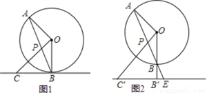 如图2,记(1)中⊙O的切线为直线l,在(1)的条件下,将切线l向下平移,设平移后的直线l与OB的延长线相交于点B′,与AB的延长线相交于点E,与OP的延长线相交于点C′,找出图2中与C′P相等的线段,并说明理由.
