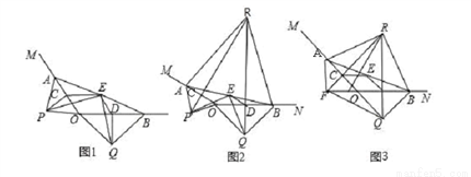 (3)如图3,若△ARB∽△PEQ,求∠MON大小.
