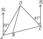 某市开展一项自行车旅游活动,线路需经A、B、C、D四地,如图,其中A、B、C三地在同一直线上,D地在A地北偏东30°方向,在C地北偏西45°方向,C地在A地北偏东75°方向.且BC=CD=20km,问沿上述线路从A地到D地的路程大约是多少?(最后结果保留整数,参考数据:sin15°≈0.25,cos15°≈0.97,tan15°≈0.27,