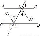 如图,直线AB,CD被EF所截,∠1+∠2=180°,EM,FN分别平分∠BEF和∠CFE.
