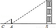 小明在测量楼高时,先测出楼房落在地面上的影长BA为15米(如图),然后在A处树立一根高2米的标杆,测得标杆的影长AC为3米,则楼高为( )