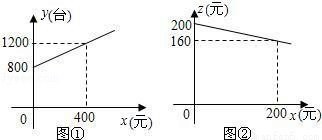 的业余生活,鼓励送彩电下乡,国家决定对购买彩电的农户实行政府补贴.规定每购买一台彩电,政府补贴若干元,经调查某商场销售彩电台数y(台)与补贴款额x(元)之间大致满足如图①所示的一次函数关系.随着补贴款额x的不断增大,销售量也不断增加,但每台彩电的收益Z(元)会相应降低且Z与x之间也大致
