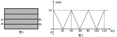 如图1,A1B1和A2B2是水面上相邻的两条赛道(看成两条互相平行的线段).甲是一名游泳运动健将,乙是一名游泳爱好者,甲在赛道A1B1上从A1处出发,到达B1后,以同样的速度返回A1处,然后重复上述过程;乙在赛道A2B2上以2m/s的速度从B2处出发,到达A2后以相同的速度回到B2处,然后重复上述过程(不考虑每次折返时的减速和转向时间).若甲、乙两人同时出发,设离开池边B1B2的距离为y(m),运动时间为t(s),甲游动时,y(m)与t(s)的函数图象如图2所示.