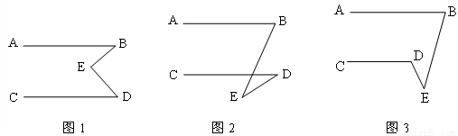 如图,已知AB//CD,猜想图1、图2、图3中∠B,∠BED,∠D之间有什么关系?请用等式表示出它们的关系,并对图2的等式说明理由。