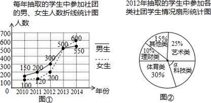 为了解学生参加社团的情况,从2010年起,某市教育部门每年都从全市所有学生中随机抽取2000名学生进行调查,图①、图②是部分调查数据的统计图(参加社团的学生每人只能报一项)根据统计图提供的信息解决下列