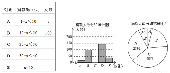 某校学生会干部对校学生会倡导的“助残”自愿捐款活动进行抽样调查,得到一组学生捐款情况的数据,对学校部分捐款人数进行调查和分组统汁后?将数据整理成如图所示的统计图(图中信息不完整).已知A、B两组捐款人数的比为1:5