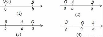 当A,B两点中有一点在原点时,不妨设点A在原点,如图(1),|AB|=|OB|=|b|=|a﹣b|;当A,B两点都不在原点时,