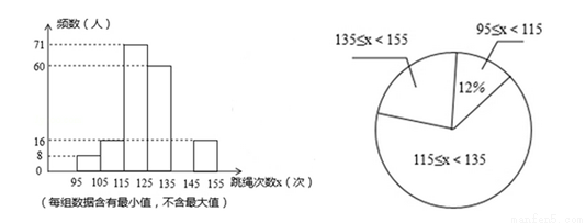 (2)请补全频数分布直方图空缺部分,直接写出扇形统计图中跳绳次数范围135≤x<155所在扇形的圆心角度数;