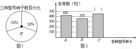 利民种子培育基地用A、B、C三种型号的玉米种子共1500粒进行发芽试验,从中选出发芽率高的种子进行推广.通过试验知道,C型号种子的发芽率为80%,根据试验数据绘制了下面两个不完整的统计图(图1、图2):