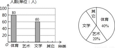 为了促进学生多样化发展,某校组织开展了社团活动,分别设置了体育类、艺术类、文学类及其它类社团(要求人人参与社团,每人只能选择一项).为了解学生喜爱哪种社团活动,学校做了一次抽样调查.根据收集到的数据,绘制成如下两幅不完整的统计图,请根据图中提供的信息,完成下列问题: