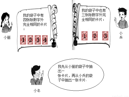 表示小冬从小丽、小兵袋子中抽出的卡片上标有的数字,请用树状图法或列表法写出(