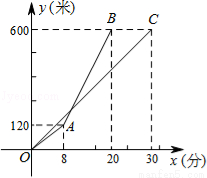 甲、乙两人沿同一路线登山,图中线段OC、折线OAB分别是甲、乙两人登山的路程y(米)与登山时间x(分)之间的函数图象.请根据图象所提供的信息,解答如下问题: