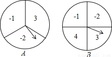 如图有A、B两个大小均匀的转盘,其中A转盘被分成3等份,B转盘被分成4等份,并在每一份内标上数字.小明和小红同时各转动其中一个转盘,转盘停止后(当指针指在边界线时视为无效,重转),若将A转盘指针指向的数字记作一次函数表达式中的k,将B转盘指针指向的数字记作一次函数表达式中的b.