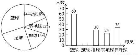 某校为了解学生对篮球、足球、排球、羽毛球、乒乓球这五种球类运动的喜爱情况,随机抽取一部分学生进行问卷调查,统计整理并绘制了以下两幅不完整的统计图: