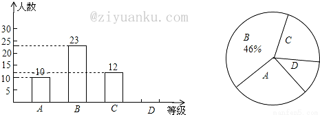 (本题满分10分)某校八年级学生全部参加“初二生物地理会考”,从中抽取了部分学生的生物考试成绩,将他们的成绩进行统计后分为A、B、C、D四个等级,并将统计结果绘制成如下的统计图,请结合图中所给的信息解答下列问题: