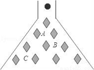如图所示,当以实心小球从入口落下,它在依次碰到每层菱形挡块时,会等可能地向左或向右落下,求小球下落到第三层B位置的概率__.