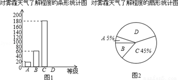 近几年来,我国持续大面积的雾霾天气让环保和健康问题成为焦点.为了调查学生对雾霾天气知识的了解程度,某校在学生中做了一次抽样调查,调查结果共分为四个等级:A.非常了解;B.比较了解;C.基本了解;D.不了解.根据调查统计结果,绘制了不完整的三种统计图表.