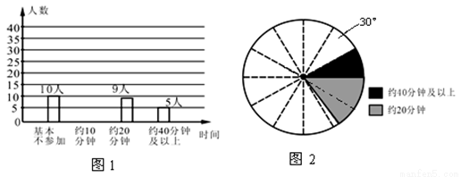(2)他们采用了最为合理的调查方法收集数据,并绘制出如图1所示的条形统计图和如图2所示的扇形统计图,请根据图1和图2所提供的信息,将图1中的条形统计图补充完整;(注:图2中相邻两虚线形成的圆心角为30°)
