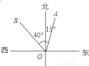 如图,OA的方向是北偏东15°,OB的方向是北偏西40°,若∠AOC=∠AOB且∠AOC,∠AOB在OA的异侧,则OC的方向是____________.