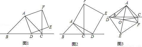 (3)如图3,当点D在线段BC的反向延长线上时,且点A,F分别在直线BC的两侧,其他条件不变; ①请直接写出CF,BC,CD三条线段之间的关系;