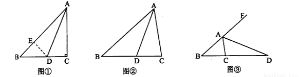 (2)如图③,当AD为△ABC的外角平分线时,线段AB、AC、CD又有怎样的数量关系?请写出你的猜想,并对你的猜想给予证明。