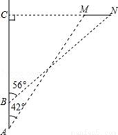 钓鱼岛自古就是中国的领土,中国有关部门已对钓鱼岛及其附属岛屿开展常态化监视监测.一日,中国一艘海监船从A点沿正北方向巡航,其航线距钓鱼岛(设M,N为该岛的东西两端点)最近距离为14.4km(即MC=14.4km).在A点测得岛屿的西端点M在点A的北偏东42°方向;航行4km后到达B点,测得岛屿的东端点N在点B的北偏东56°方向,(其中N,M,C在同一条直线上),求钓鱼岛东西两端点MN之间的距离(结果精确到0.1km).(参考数据:sin42°≈0.67,cos42°≈0.74,tan42°≈0.90,sin56°≈0.83,cos56°≈0.56,tan56°≈1.48)