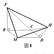 如图1,以□BMDC的两相邻边CB、CD为腰,在□BMDC的外侧,作两个等腰Rt△CBF和Rt△CDH,则□ BMDC中与C相对的顶点M与这两等腰直角三角形的两顶点F、H形成一个新的等腰直角三角形FMH. 请证明△FMH为等腰直角三角形。