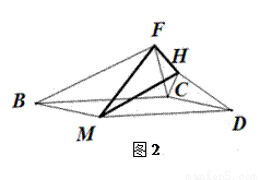 如图2,以□BMDC的两相邻边CB、CD为腰, 在□BMDC的外侧,作两个等腰△CBF和△CDH,使其顶角∠CBF=∠CDH=α,则□BMDC中与C相对的顶点M与两等腰三角形的两顶点F、H形成一个新的等腰三角形,写出顶角∠FMH的度数。试说明理由。