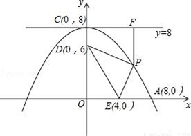 如图,抛物线的顶点坐标为C(0,8),并且经过A(8,0),点P是抛物线上点A,C间的一个动点(含端点),过点P作直线y=8的垂线,垂足为点F,点D,E的坐标分别为(0,6),(4,0),连接PD,PE,DE.