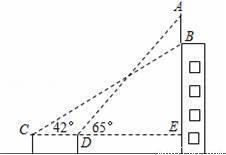 如图,某大楼顶部有一旗杆AB,甲乙两人分别在相距6米的C、D两处测得B点和A点的仰角分别是42°和65°,且C、D、E在一条直线上.如果DE=15米,求旗杆AB的长大约是多少米?(结果保留整数)