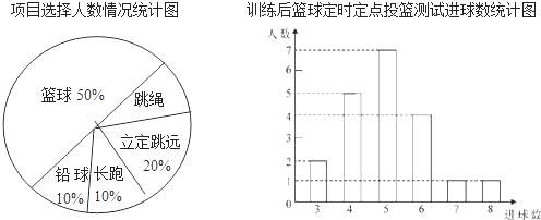八年级(1)班学生在完成课题学习“体质健康测试中的数据分析”后,利用课外活动时间积极参加体育锻炼,每位同学从篮球、跳绳、立定跳远、长跑、铅球中选一项进行训练,训练后都进行了测试.现将项目选择情况及训练后篮球定时定点投篮测试成绩整理后作出如下统计图.