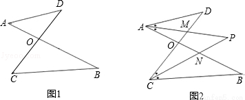 ,线段AB、CD相交于点O,连接AD、CB,我们把形如图1的图形称之为“8字形”. 在图2中,∠DAB和∠BCD的平分线AP和CP相交于点P,并且与CD、AB分别相交于M、N.若∠DAO=50°,∠OCB=40°,∠P=35°,∠D = _________