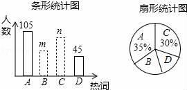 (3)扇形统计图中,热词B所在扇形的圆心角的度数是 ;