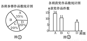 某校组织了一次七年级科技小制作比赛,有A、B、C、D四个班共提供了100件参赛作品,C班提供的参赛作品的获奖率为50%,其他几个班的参赛作品情况及获奖情况绘制在下列图①和图②两幅尚不完整的统计图中.