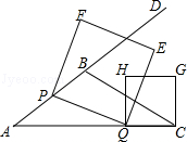 ,动点P从A点出发,沿射线AB方向以每秒5个单位的速度运动,动点Q从C点出发,以相同的速度在线段AC上由C向A运动,当Q点运动到A点时,P、Q两点同时停止运动,以PQ为边作正方形PQEF(P、Q、E、F按逆时针排序),以CQ为边在AC上方作正方形QCGH.