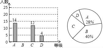 某校为了解本校九年级学生足球训练情况,随机抽查该年级若干名学生进行测试,然后把测试结果分为4个等级:A、B、C、D,并将统计结果绘制成两幅不完整的统计图.