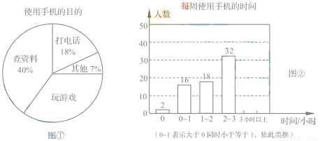 某中学开展了“手机伴我健康行”主题活动.他们随机抽取部分学生进行“手机使用目的”和“每周使用手机时间”的问卷调查,并绘制成如图①②的统计图。已知“查资料”人人数是40人。
