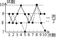 甲、乙、丙、丁四名射击运动员在选拔赛中,每人射击了10次、甲、乙两人的成绩如表所示,丙、丁两人的成绩如图所示.欲选一名运动员参赛,从平均数和方差两个因素分析,应选( ).