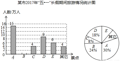 随着交通道路的不断完善,带动了旅游业的发展,某市旅游景区有A、B、C、D、E等著名景点,该市旅游部门统计绘制出2017年“五•一”长假期间旅游情况统计图,根据以下信息解答下列问题: