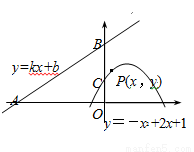 (2)若点P(x,y)是抛物线y=-x2+2x+1上的任意一点,设点P到直线AB的距离为d,求d关于x的函数解析式,并求d取最小值时点P的坐标;